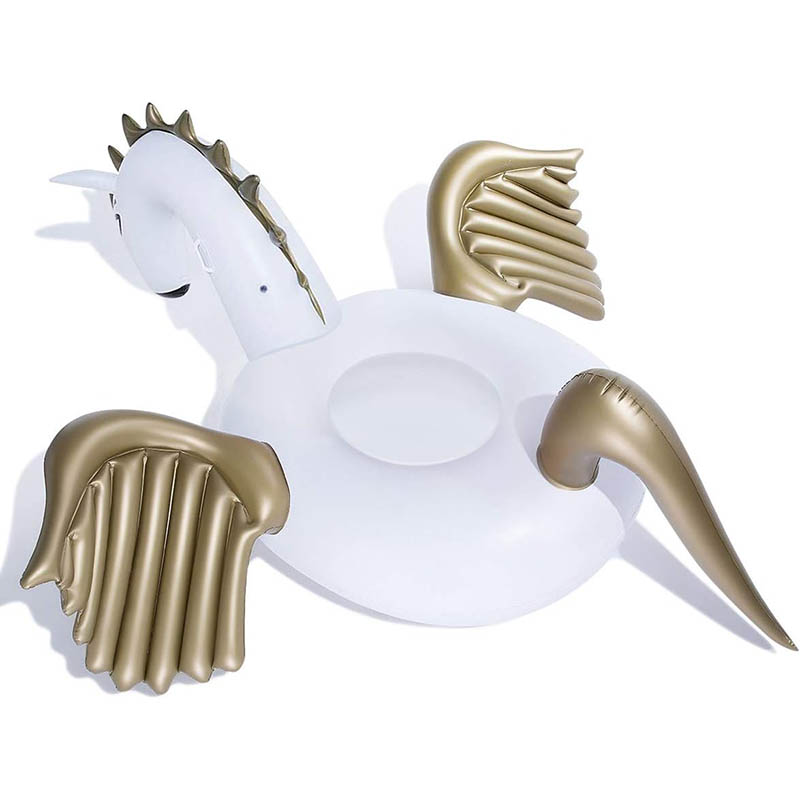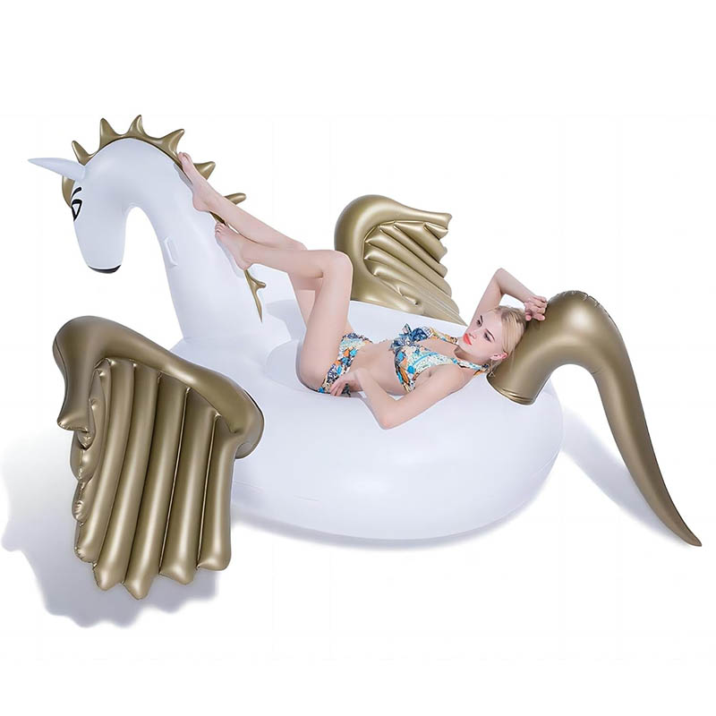 The striking Pegasus design features a proud white body, golden horn, flowing mane spikes, elegant golden wings for added stability, and a long neck that doubles as a comfy headrest. The spacious circular base provides a stable raft platform perfect for lounging, sunbathing, pool parties, or as vibrant outdoor decor that sparks joy and photo ops.